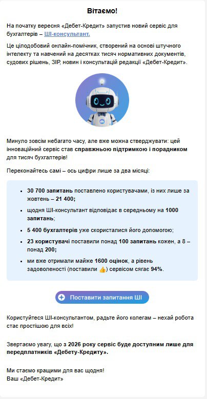 Наш ШІ-консультант навчений на тисячах матеріалів з порталу «Дебет-Кредит»: статтях, консультаціях, законодавчих актах, роз’ясненнях держорганів тощо.