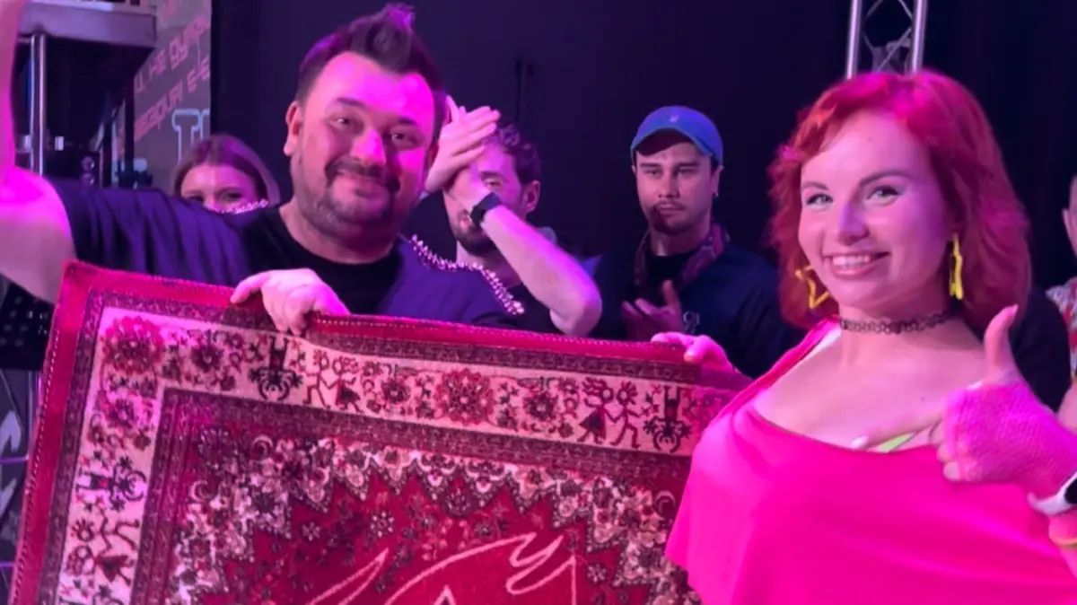 На сцене артист наградил череповчанку крепкими объятиями и своим фирменным ковром, на котором есть портрет самого Сергея и картинки человечков с обложек всех альбомов «Руки вверх». Обещал оставить на нем автограф, но сильно торопился и покинул бар достаточно быстро.