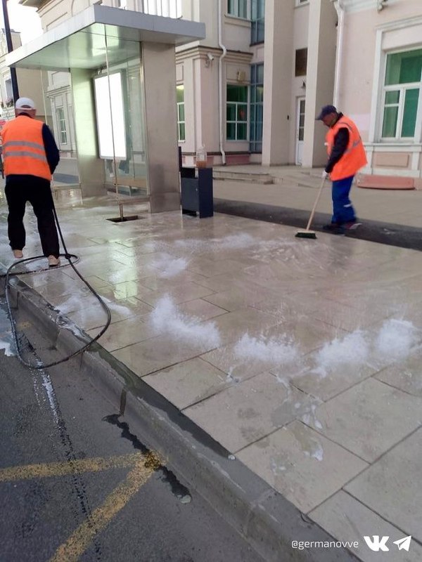 - Первыми специалистов со швабрами и спецсредством увидели остановки на Советском проспекте. Темные пятна на светлой плитке здесь особенно заметны. Если быть совсем точным, то "шампунь" нужно писать в кавычках. Потому что для мытья тротуаров используется специальное средство "Clasta - 100". Оно предназначено для чистки полов на объектах пищевой промышленности и в ресторанах. Имеет все необходимые сертификаты и безопасно для животных и человека, - сообщил мэр города Вадим Германов.