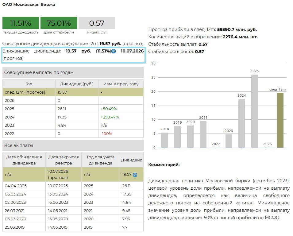 Совет директоров Мосбиржи рекомендовал выплату дивидендов за 2025 г. в размере 19,57 рублей на акцию. Дата закрытия реестра на текущий момент не определена.