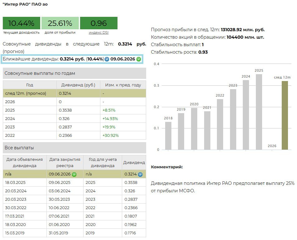 Совет директоров Интер РАО рекомендовал выплату дивидендов за 2025 год в размере 0,321425305784583 рублей на акцию. Дата закрытия реестра 9 июня 2026 г.