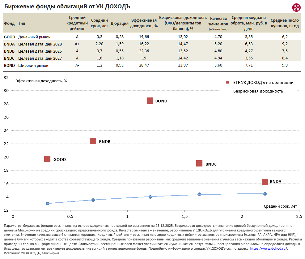 В таблице и на графике ниже представлены основные параметры всех наших биржевых фондов облигаций по состоянию на 23 декабря 2025 года - от средних сроков и эффективных доходностей к погашению, до среднего качества и рейтинга эмитентов. Текущие доходности ОФЗ и банковских депозитов на сопоставимые сроки приведены в столбце "Безрисковые доходности" и отдельной кривой доходностей на графике.