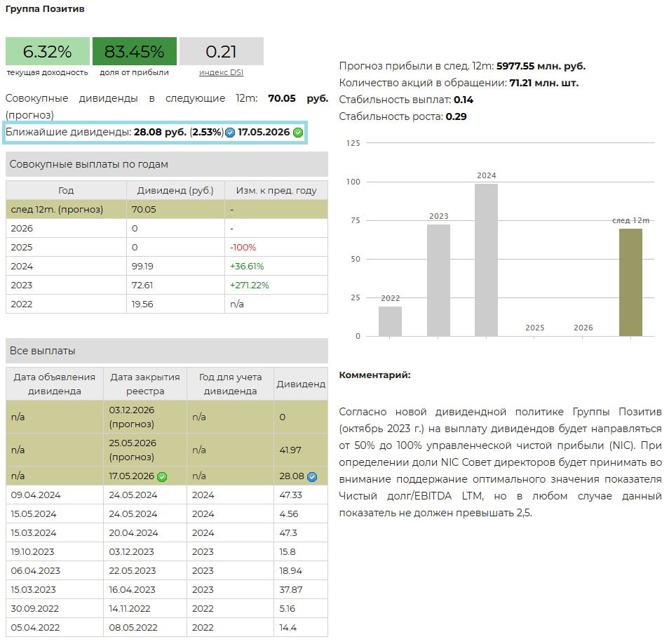 Совет директоров группы Позитив рекомендовал выплату дивидендов за 1 квартал 2026 г. в размере 28,08 рублей на акцию. Дата закрытия реестра 17 мая 2026