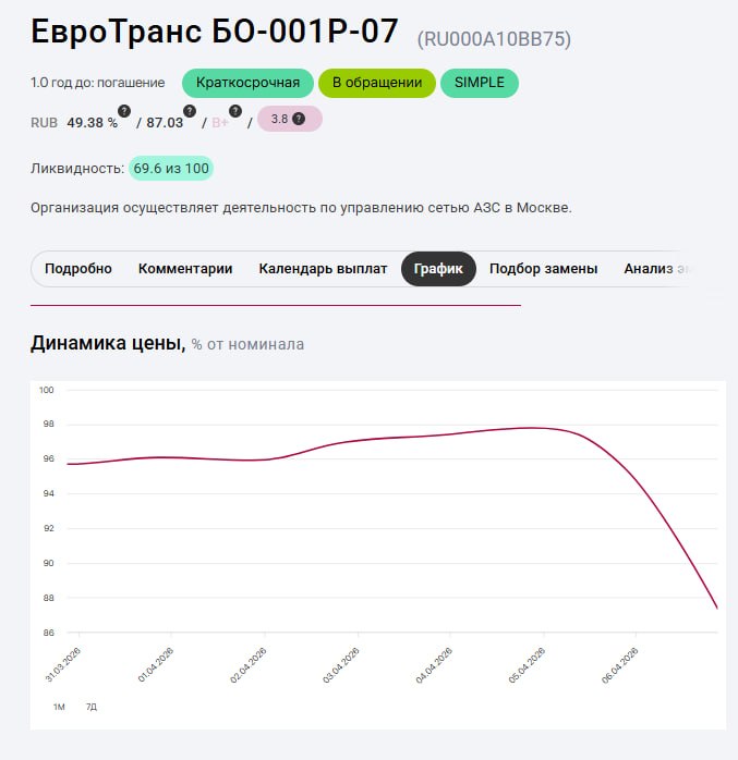 ЕвроТранс исполнил обязательства по выплате дохода по 12-му купону облигаций серии БО-001Р-07, но продолжает беспокоить инвесторов. Эмитент допустил технический дефолт по этой выплате. В конце марта тех. дефолт также наблюдался по народным облигациям Евротранса. На этом фоне «Эксперт РА» понизил рейтинг кредитоспособности компании до уровня ruC, изменил прогноз на развивающийся и продлил статус «под наблюдением».