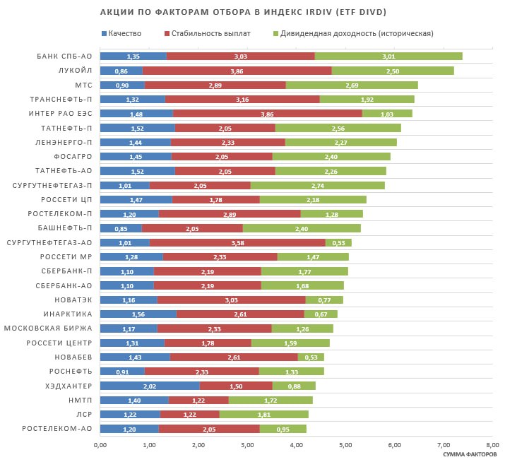 Вклад каждого из факторов отбора в индекс для каждой акции можно увидеть на диаграмме внизу поста. Уровень отражения инвестиционных факторов в IRDIV и в индексе МосБиржи, а также отраслевую структуру и базовые параметры вы можете найти в полной версии этого поста в Дзен, а также в этой презентации (pdf).