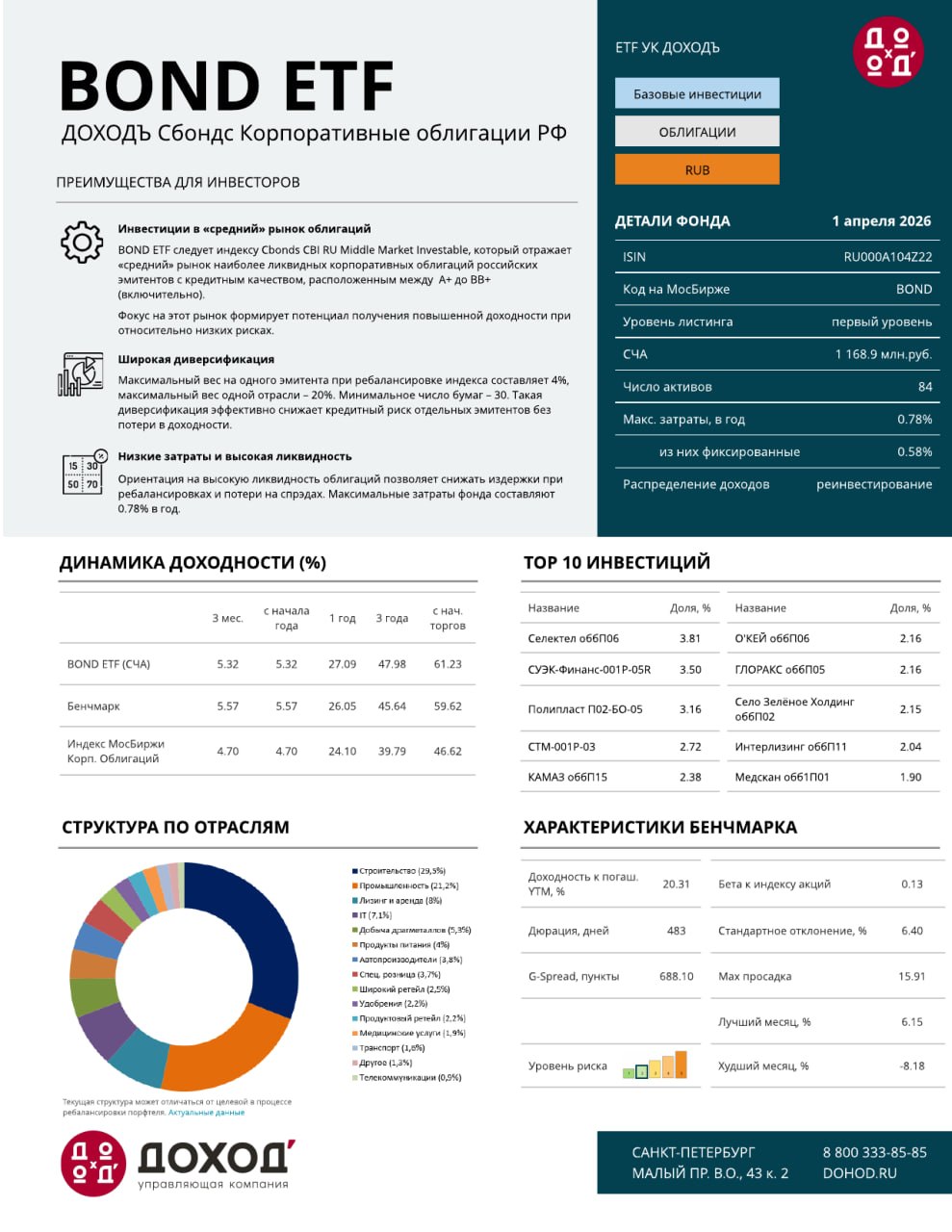1 апреля вступил в силу новый состав индекса Cbonds CBI RU Middle Market Investable, и мы ребалансируем наш биржевой фонд корпоративных облигаций BOND ETF, который ему следует.
