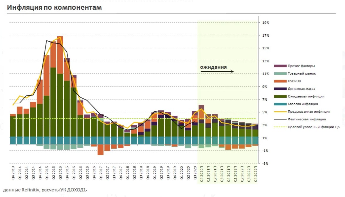 Ослабление рубля и рост денежной массы (за счет расширения дефицита бюджета) в ближайшее время приведет к росту инфляции выше цели Банка России в 4%. Однако в долгосрочном периоде относительно медленное восстановление экономики (вследствие недостаточного расширения дефицита бюджета) вновь создаст дезинфляционное воздействие на цены. Поэтому Банк России, вероятно, еще, по крайней мере один раз снизит ключевую ставку, но не на ближайшем заседании.
