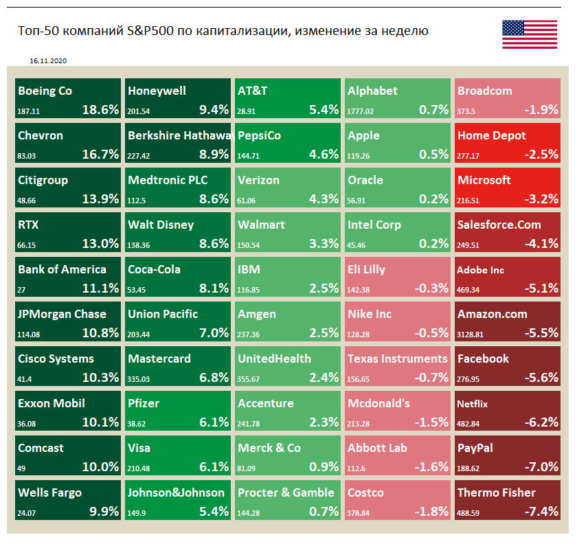 📈 Крупные банки и финансовые корпорации США, такие как Citigroup (+13,9%), Bank of America (+11,1%), JPMorgan Chase (+10,8) и Wells Fargo (+9,9%) оказались в лидерах роста на прошлой неделе также благодаря позитивным новостям о вакцине против Covid-19.