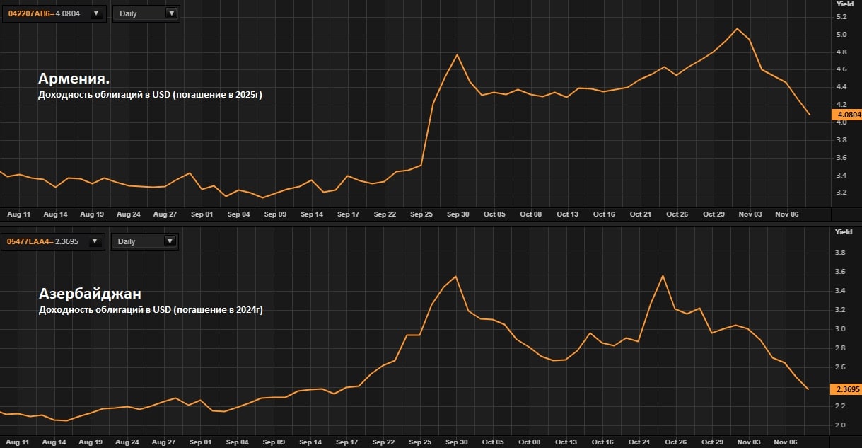 Долларовые облигации Армении с погашением в 2025 году прибавляют около 1%, доходность опустилась до 4%.