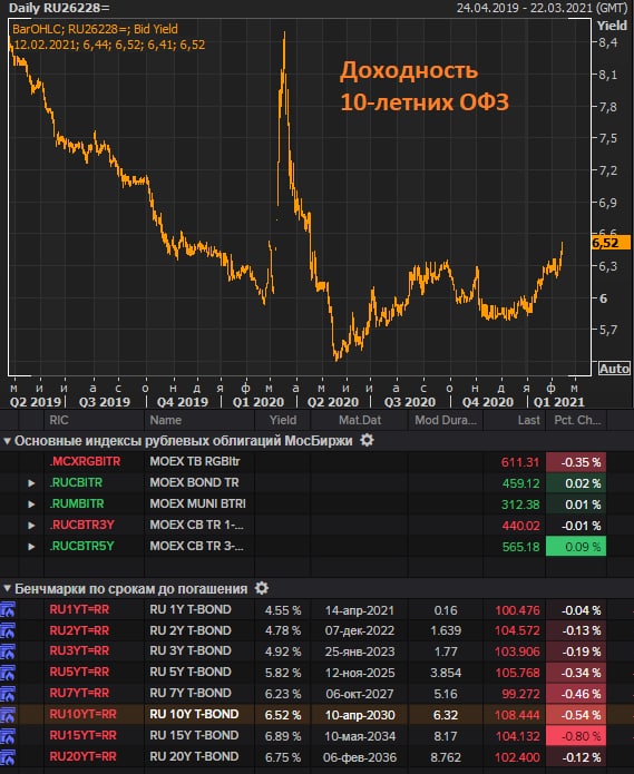 На этом фоне доходность 10-летних ОФЗ превысила 6.5%, доходность 15-летннего выпуска приближается к 7%.