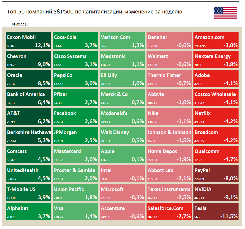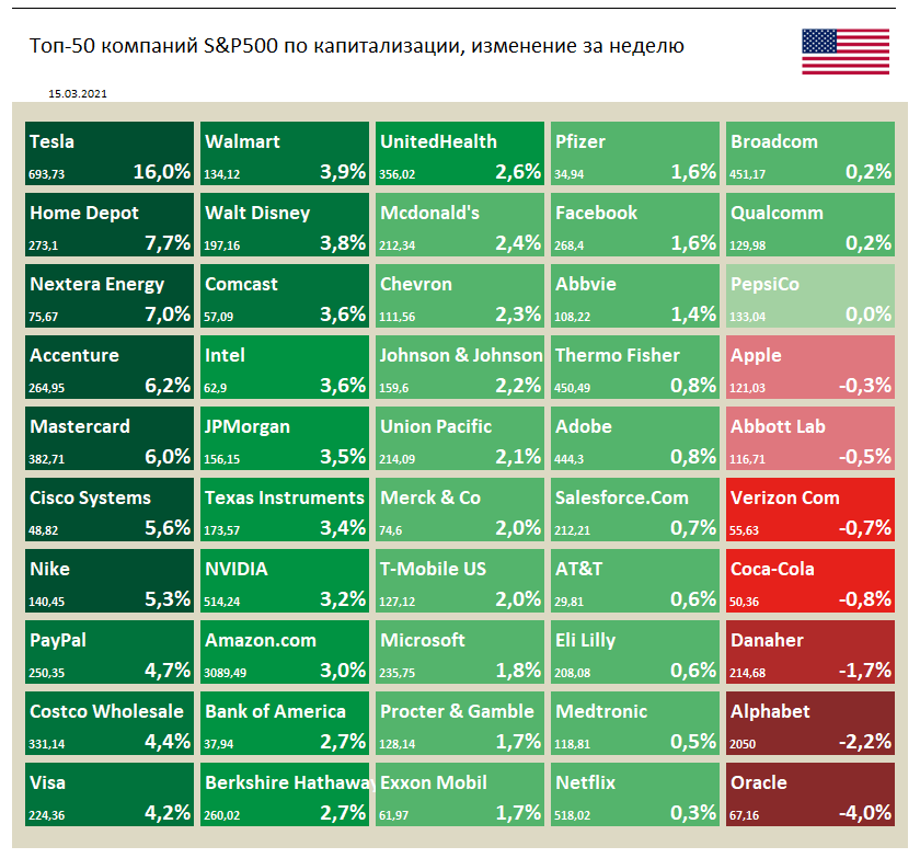 📉 Акции Tesla (-11,5%) продолжают свое падение. В прошлый четверг председатель ФРС Джером Пауэлл заявил, что США может столкнуться с ростом цен и инфляцией после пандемии. Рынок обеспокоен возможностью роста процентных ставок, что способствует коррекции переоцененных акций технологических компаний. Дополнительное давление на акции оказывает рост конкуренции в отрасли электрокаров и дефицит полупроводников, вынуждающий многих автопроизводителей приостановить производственные линии.