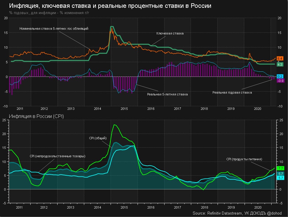 Реальные процентные ставки даже после роста доходностей облигаций в последние несколько недель остаются в отрицательной зоне или близки к нулю (в зависимости от сроков).
