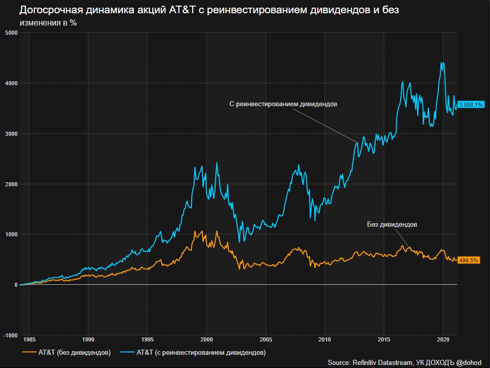 фондов и возможности относительно дешево покупать любое число акций стало легче собрать более разнообразный портфель, в который очень вероятно попадут акции-лидеры и по дивидендам и по росту и полагаться исключительно на удачу не придется. Идея рассказа этой истории в том, как работает реинвестирование (будь то дивиденды или периодическое инвестирование сбережений) на долгосрочном горизонте для долгосрочных целей.