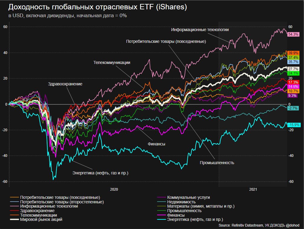 Глобальные классы активов. Широкий рынок акций США и компании малой капитализации выглядят лучше коллег и продолжают тенденцию этого года к переоценке технологического сектора и восстановлению качественных циклических акций и акций ценности. Сильное отставание акций с импульсом роста (momentum) довольно редкое, но закономерное явление.