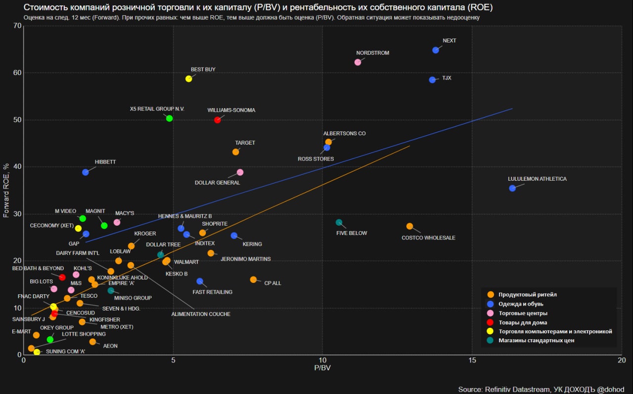 В этот раз добавили линии регрессии для продуктового ритейла 🟠 и сегмента "Одежда и обувь" 🔵. Они показывают взаимосвязь между оценкой стоимости (P/BV) и эффективностью (ROE).