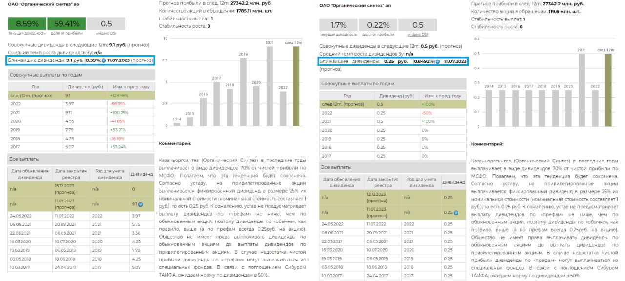 Совет директоров Казаньоргсинтеза рекомендовал дивиденды за 2022 год в размере 9,1 рублей на обыкновенную и 0,25 рубля на привилегированную акцию. Дата закрытия реестра: 11 июля 2023.