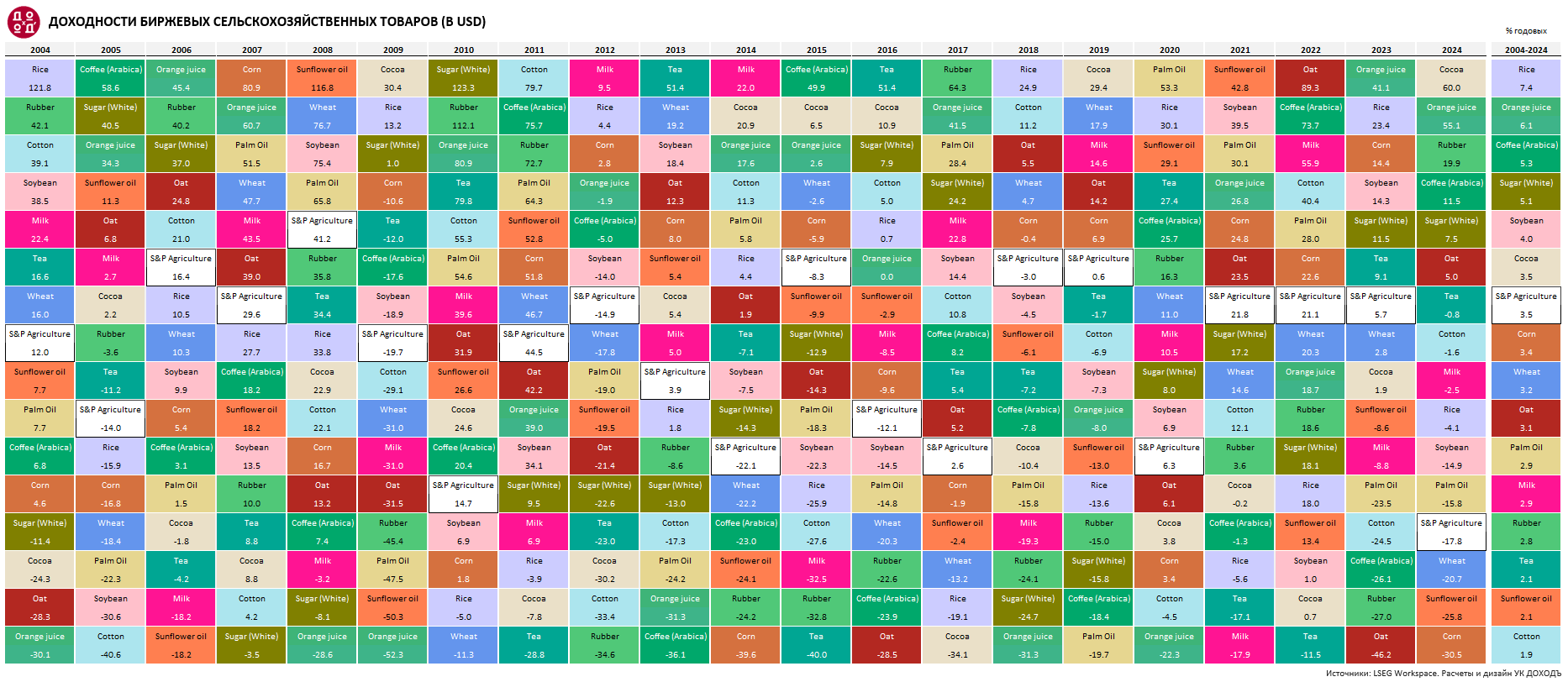 🧮 От кофе до хлопка. Доходности биржевых сельскохозяйственных товаров в USD, 2004-2024гг.