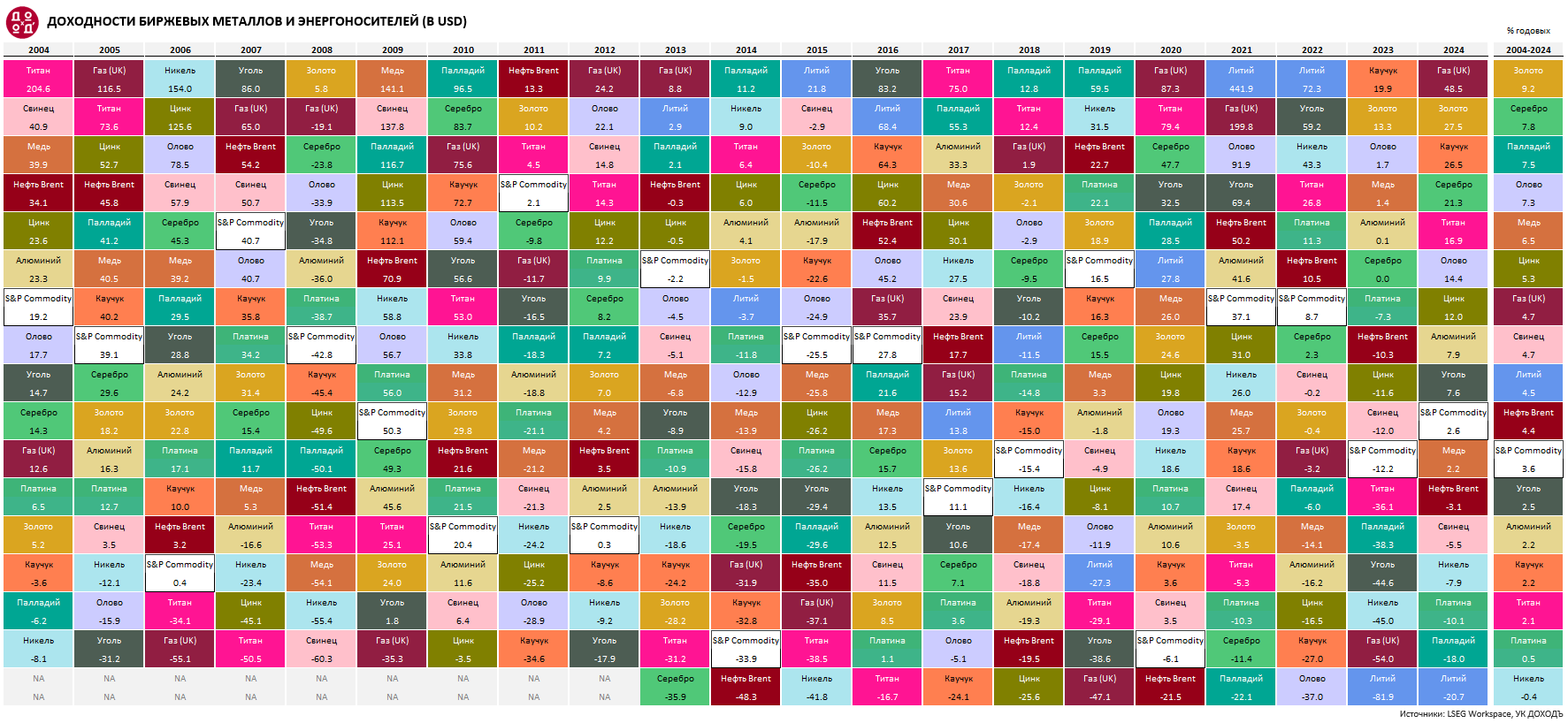 🧮 От золота до угля. Доходности биржевых металлов и энергоносителей в USD, 2004-2024гг.