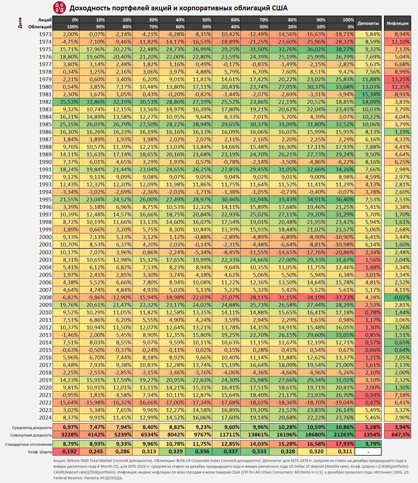 ▪️ Доходности портфелей, состоящих из российских акций и облигаций, а также доходность банковских депозитов и инфляция в 2003-2024 гг.