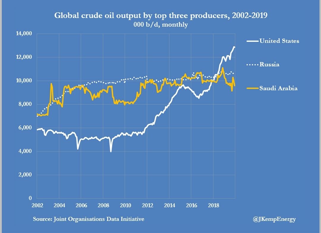 На графике – производство нефти (тыс. барр./день) Саудовской Аравией, Россией и США, 2002-2020гг. Источник: https://twitter.com/JKempEnergy/status/1235883947705409537?s=20 (почитайте, John Kemp - отличный эксперт по теме нефти и газа)