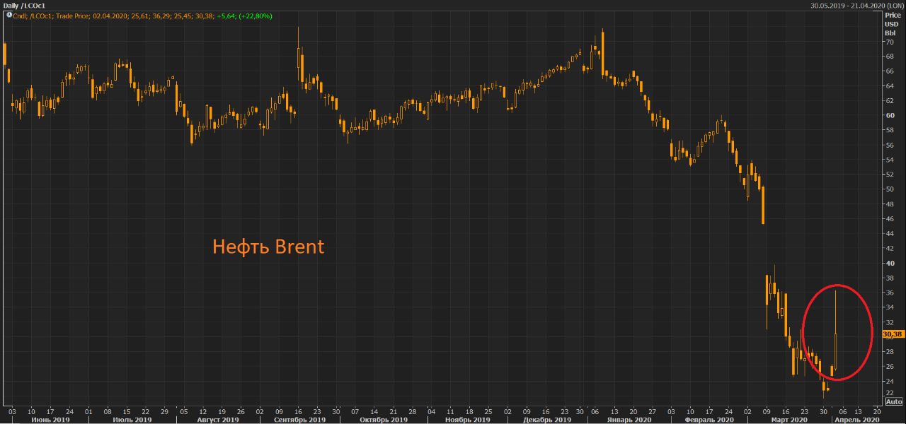 Нефть Brent растет более чем на 23% (торгуется выше $30 за баррель). Российская марка Urals - почти на 20% (~$20).