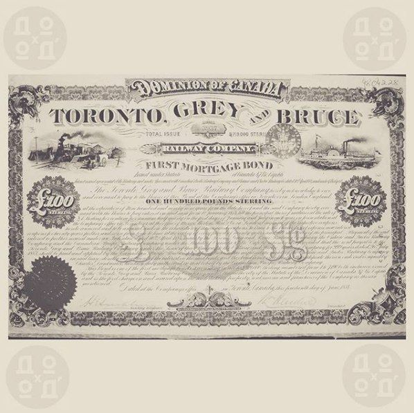 До сих пор находятся в обращении и выплачивают процент 4%-ные ипотечные золотые облигации первой очереди Toronto, Grey & Bruce Railway Соmpany, датированные 1 января 1884 года и подлежащие погашению 14 июня 2883 года. Облигации продаются только в купонной форме достоинством 100 фунтов стерлингов. Купоны (40 на одном листе, которых достаточно на 20 лет) оплачиваются в Монреале (в канадских долларах, поскольку выплата золотом запрещена) или в Лондоне (в фунтах стерлингов). По данным Moody's Transportation Мanual, собственность компании была сдана в аренду Ontario & Quebec Railway Соmpany на 999 лет при ежегодной арендной плате, равной проценту по 4%-ным ипотечным облигациям первой очереди. 1 января 1884 года аренда была переведена на Canadian Pacific Railway Соmpany, которая теперь называется Canadian Pacific Limited.