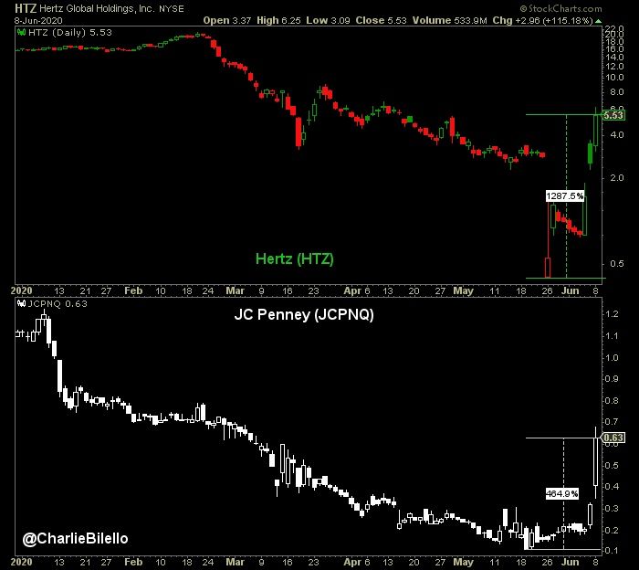 Действительно, последнее время большинство "взрывных ралли", начиная с ETF на нефть и акции авиакомпаний и заканчивая такими отдельными акциями банкротящихся или близких к банкротству компаний как Hertz, JC Penney, Whiting Petroleum (выросли на 95% в понедельник), Chesapeake Energy (+182%) и GNC (+106%), были связаны с ростом позиций на Robinhood.