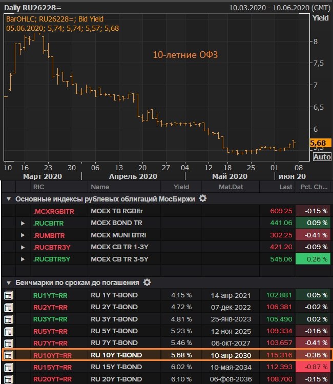 10-летние государственные облигации реагируют снижением цены на 0.36%. Доходность выросла до 5.68%. 15-летние бумаги теряют 0.87%. В общем длинные бумаги кажутся уже не столь интересными как средние по соотношению риск/доходность.
