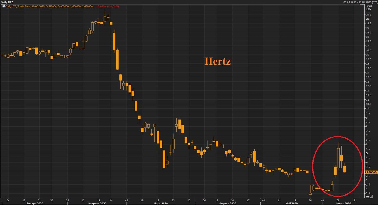 Акции Hertz теряют сегодня более 30% и около 50% за последние два дня. Напомним, компания подала заявление о банкротстве. Это означает, что кредиторы, а не акционеры решат ее дальнейшую судьбу и почти в любом случае, лучший исход для акционеров - получение небольшой доли в новой реорганизованной компании.