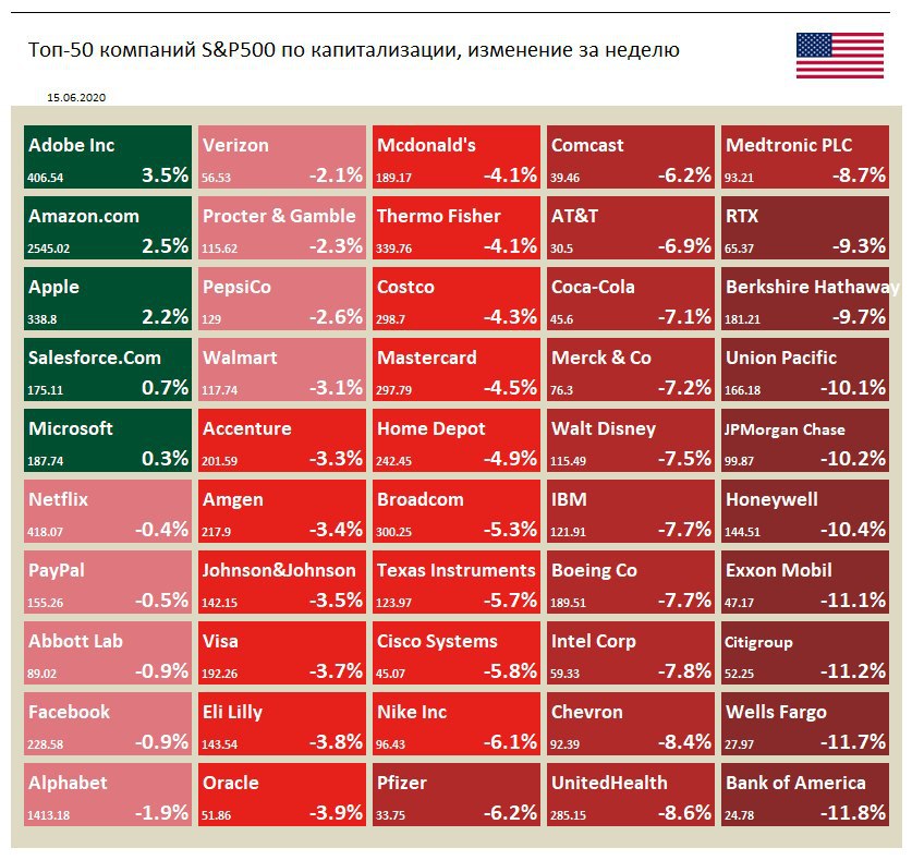 Лучше рынка выглядят акции Adobe, разработчика ПО. Финансовые результаты компании говорят об устойчивости бизнеса к кризису. На неделе Adobe отчиталась о рекордном росте выручки по итогам II финансового квартала 2020 года.