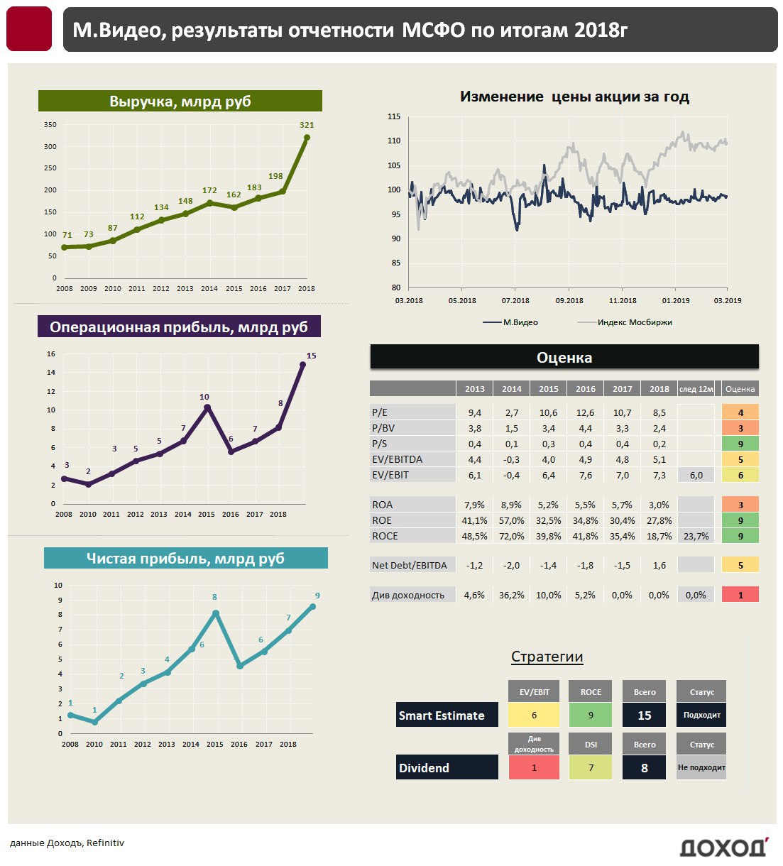 С учетом роста выручки и синергии от сокращения издержек от присоединения Эльдорадо, мы ждем операционную прибыль компании на уровне 18 млрд рублей по итогам 2019 года. Это формирует мультипликатор EV/EBIT (exp) на уровне 6x, что близко к среднерыночному уровню. Рентабельности капитала достаточно, чтобы попасть в портфель по стратегии Smart Estimate.