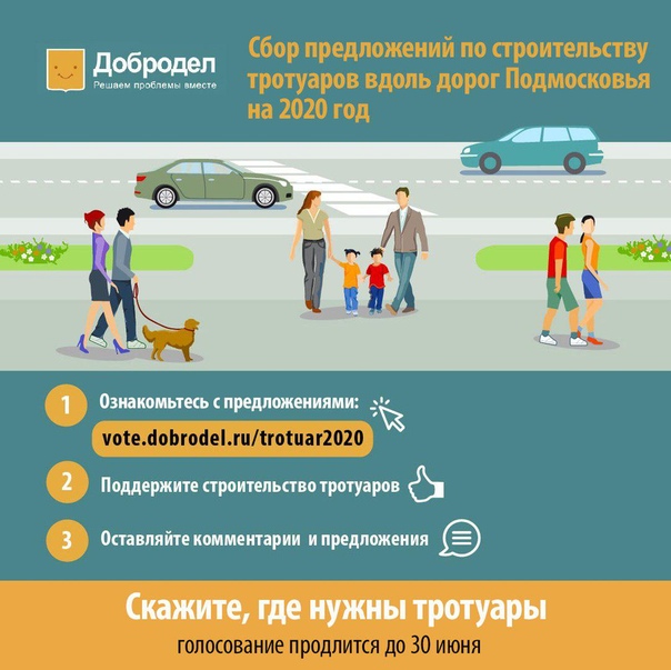 На портале «Добродел» (vote.dobrodel.ru/trotuar2020) проходит сбор предложений по строительству тротуаров вдоль региональных автомобильных дорог в 2020 году. Принять участие в опросе могут зарегистрированные пользователи на портале «Госуслуги» или прошедшие упрощенную форму регистрации через электронную почту.