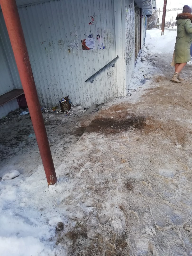 Лед, на льду грязь, чтобы "люди не скользили", рядом мусор и увенчивает весь этот "пейзаж" коробка из профлиста. Так выглядит типичная автобусная остановка в столице Поморья🤦🏻♂️