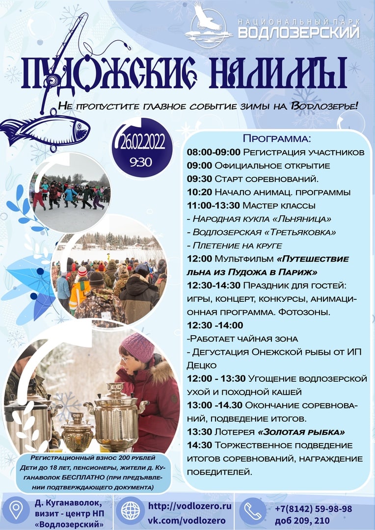 Национальный парк "Водлозерский" (Карелия, Архангельская область) приглашает 26 февраля 2022 на фестиваль подледной рыбной ловли "Пудожские налимы"!🐟🐟🐟
