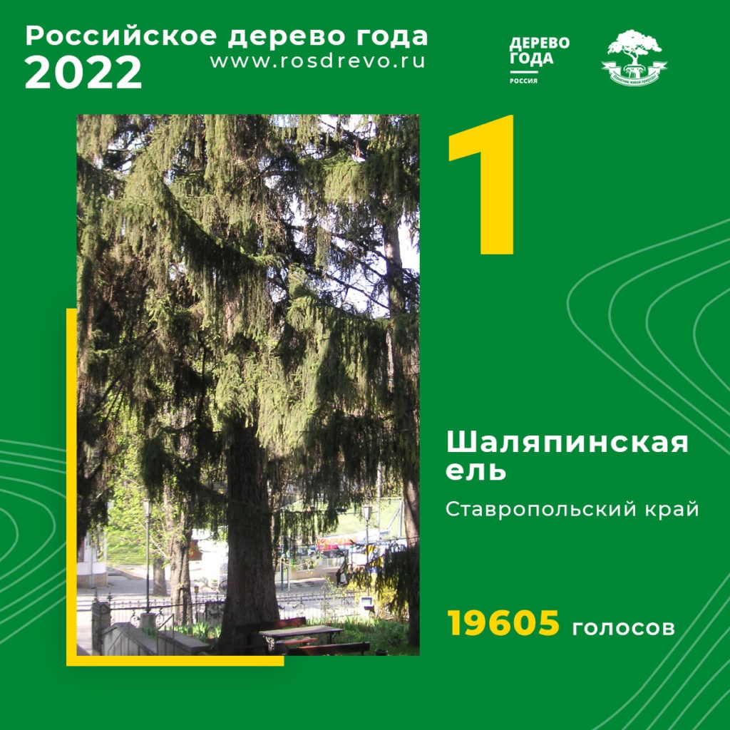 Главным деревом страны – 2022 стала «Шаляпинская ель» Ставропольского края. За нее было отдано 19605 голосов.