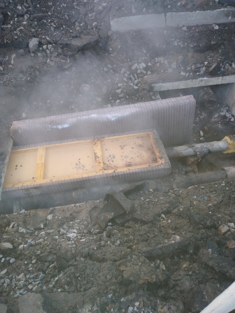 на фото ноу-хау от ТГК-2 в виде использования диванов для утепления и затыкания дырок в теплотрассе