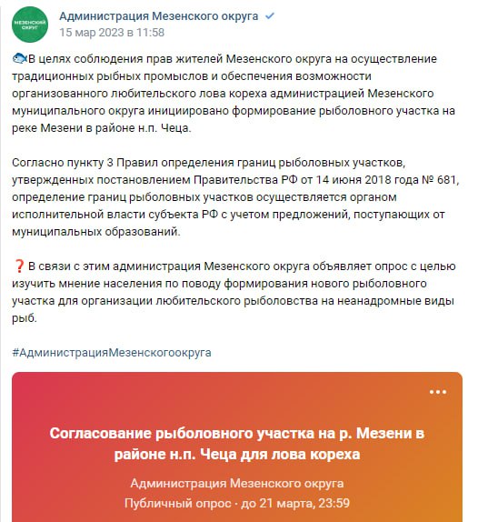 Ноу-хау продемонстрировали чиновники Мезенского района - организовали опрос в ВК по поводу организации рыболовного участка в месте традиционной рыбалки местных жителей.