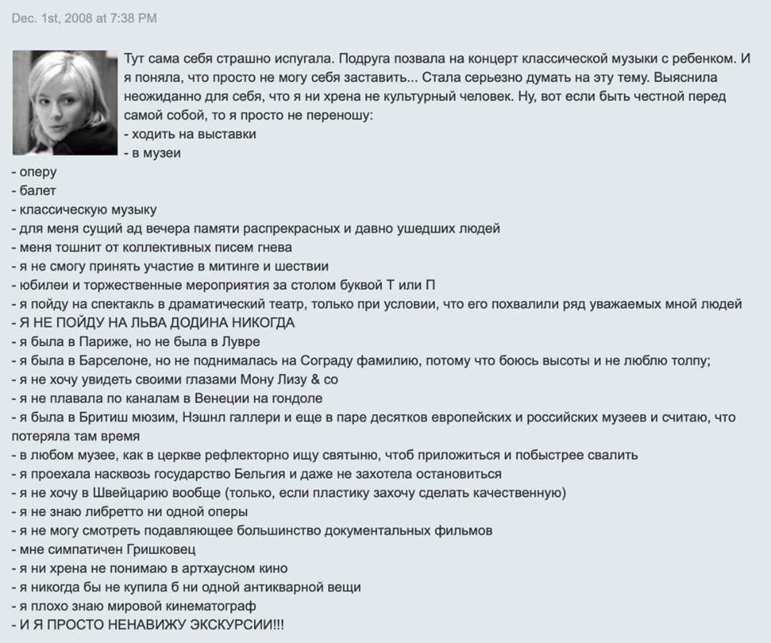Тем временем в telegram-каналах обсуждают фотографию министра (?) в футболке с надписью: «Кто вы такие? Что вам надо? Я вас не знаю. Идите на...й» и «жж» пользователя под ником kropalik, который, вероятно, вела Ольга Любимова. Автор, например, признается, что не считает себя культурным человеком и «просто не переносит: ходить на выставки, в музеи, оперу, балет».