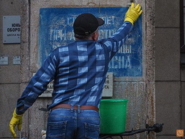 Предупреждение об опасности при артобстреле, оставленное на 14-м доме по Невскому проспекту в память о погибших во время блокады Ленинграда, второй раз за неделю приходится оттирать от краски. Вандалов ищут.