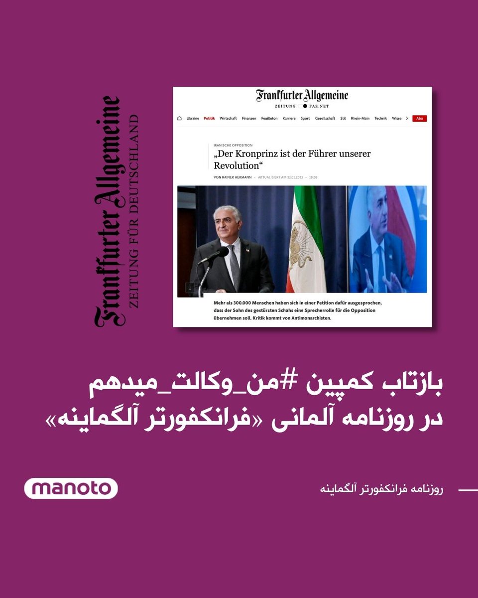 🔷روزنامه آلمانی «فرانکفورتر آلگماینه» در گزارشی با عنوان «ولیعهد رهبر انقلاب ماست» به بازتاب کمپین #من_وکالت_میدهم پرداخته است.