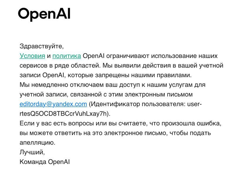 «Мы выявили действия в вашей учетной записи OpenAl, которые запрещены нашими правилами, - лаконично констатировал безликий алгоритм и вынес свой вердикт, - Мы немедленно отключаем ваш доступ к нашим услугам…».