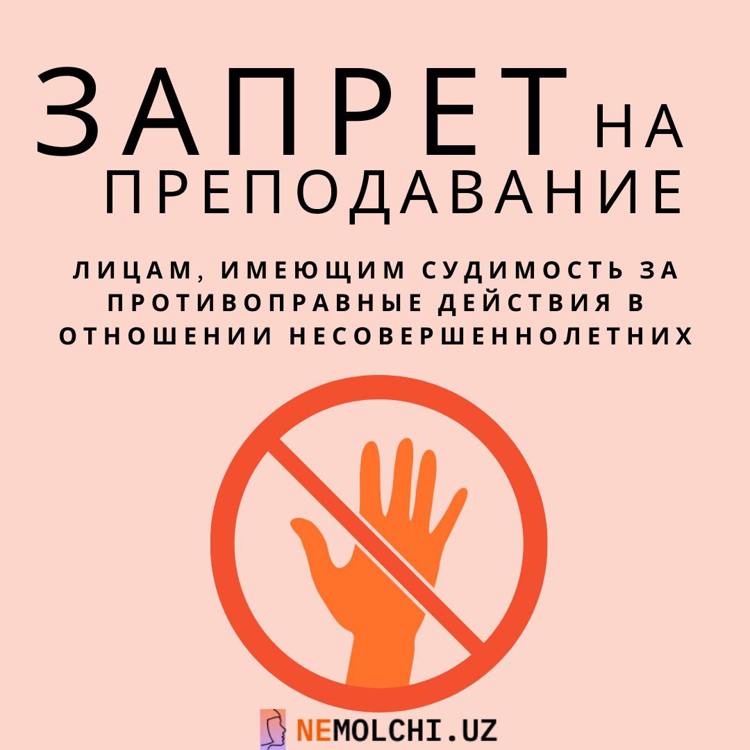 Сегодня опубликован Указ Президента Республики Узбекистан от 11 мая 2022 года № УП–134. Пунктом 11 приложения №1 к Указу предусмотрено "Наложение запрета на осуществление трудовой деятельности в общих средних образовательных учреждениях лиц, привлекавшихся к ответственности за совершение противоправных деяний в отношении детей".