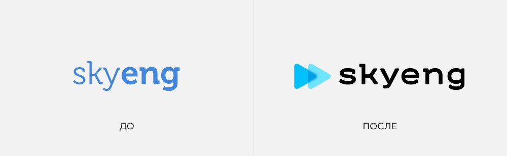 Онлайн-школа английского языка Skyeng изменила фирстиль и логотип с момента основания в 2012 году. Айдентику разработало бренд-бюро «Щука». Изменился шрифт логотипа. Новый логотип — не леттеринг. Он набирается фирменным шрифтом.