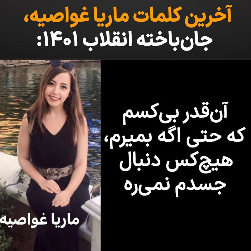 «من #ماریا_غواصیه هستم. من کشته شدم، در تاریخ ۱۴ آبان ۱۴۰۱. ۲۱ سالم بود، متولد ۱۰ مرداد ماه ۱۳۸۰.