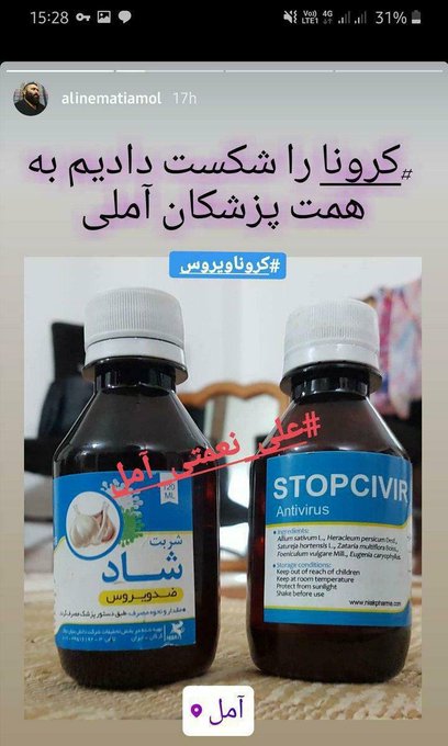 🔺چند ماه پیش صدا و سیما با این شخص مصاحبه میکنه و این شخص اعلام میکنه که. داروی کرونا رو با موفقیت در مازندران آزمایش کردند. تبلیغی که باعث میشه هر شیشه شربت STOPCIVIR چندین میلیون تومن در بازار سیاه فروش بره.