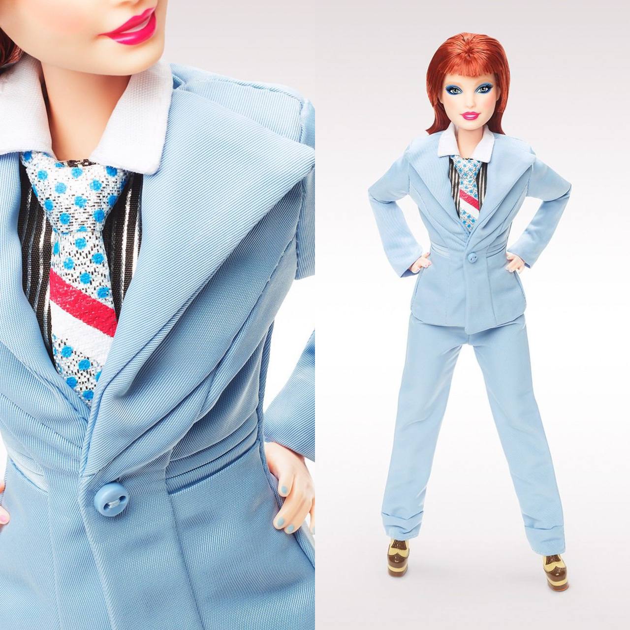 Mattel выпустили куклу в образе легендарного Дэвида Боуи. Релиз приурочен к 50-летию выхода альбома «Hunky Dory». Голубой костюм, рубашка в полоску из фольги, галстук, туфли на платформе и яркие тени — полное воплощение глэм эпохи 70-х.