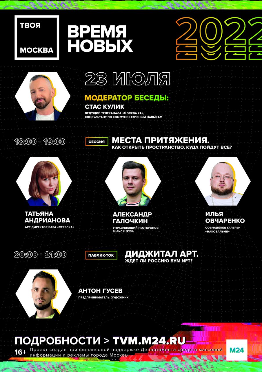 Как открыть пространство, которое станет точкой притяжения для москвичей и гостей города? Что все-таки может «выстрелить» — арт или генеративное искусство? Какие NFT-кейсы 2022 года стали самыми эффективными? На эти и другие вопросы ответят спикеры медиафестиваля.