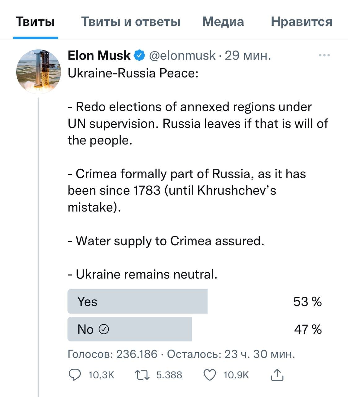 Тем временем Илон Маск в своем Твиттере назвал Крым российским и предложил свой план по урегулированию: