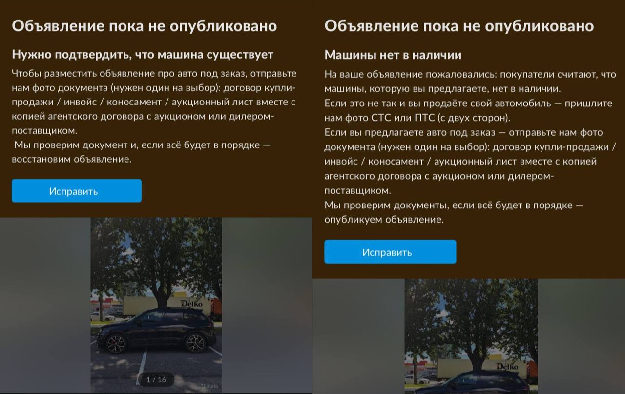 Мое предположение — владельцы неохотно загружали свои СТС/ПТС, поэтому, дабы их хоть как-то стимулировать (причем в принудительном порядке), сервис начал отклонять уже запущенные или требующие перепубликации объявления. Как это выглядит: объявление улетает в архив, вы заходите, дабы его снова сделать активным, оно улетает на модерацию, а затем отклоняется с разными причинами. У меня их было 2: автомобиля нет в наличии, потому что на это якобы пожаловались пользователи и автомобиля не существует. Подозреваю, что и то и другое — чисто формальные причины для отклонения, потому что я ради интереса переотправлял объявление на модерацию, ничего не меняя, а причины каждый раз менялись. Кроме того, банально не понимаю, как вообще может не существовать автомобиля, если я загрузил его VIN-номер?