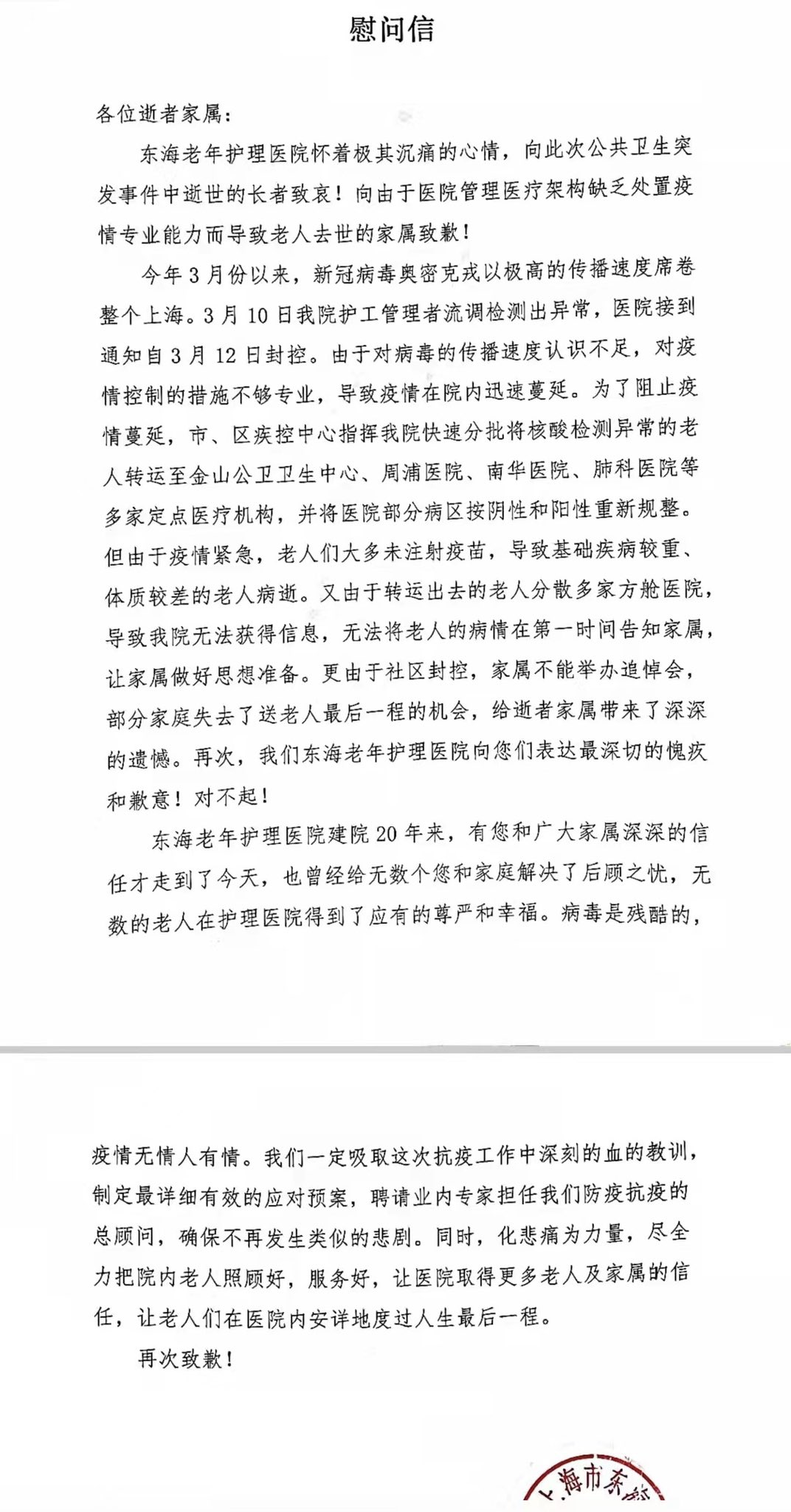 记者又取得东海护理院向过世患者家属所致慰问信,其中院方承认缺乏专业并深感歉疚。东海护理院4月3日过世的一位72岁死者亲属对记者说,他姐姐房间共6人、有5位过世;就他所知档案记载死者采检为阴性,他表示在弄清死因前不愿火化。